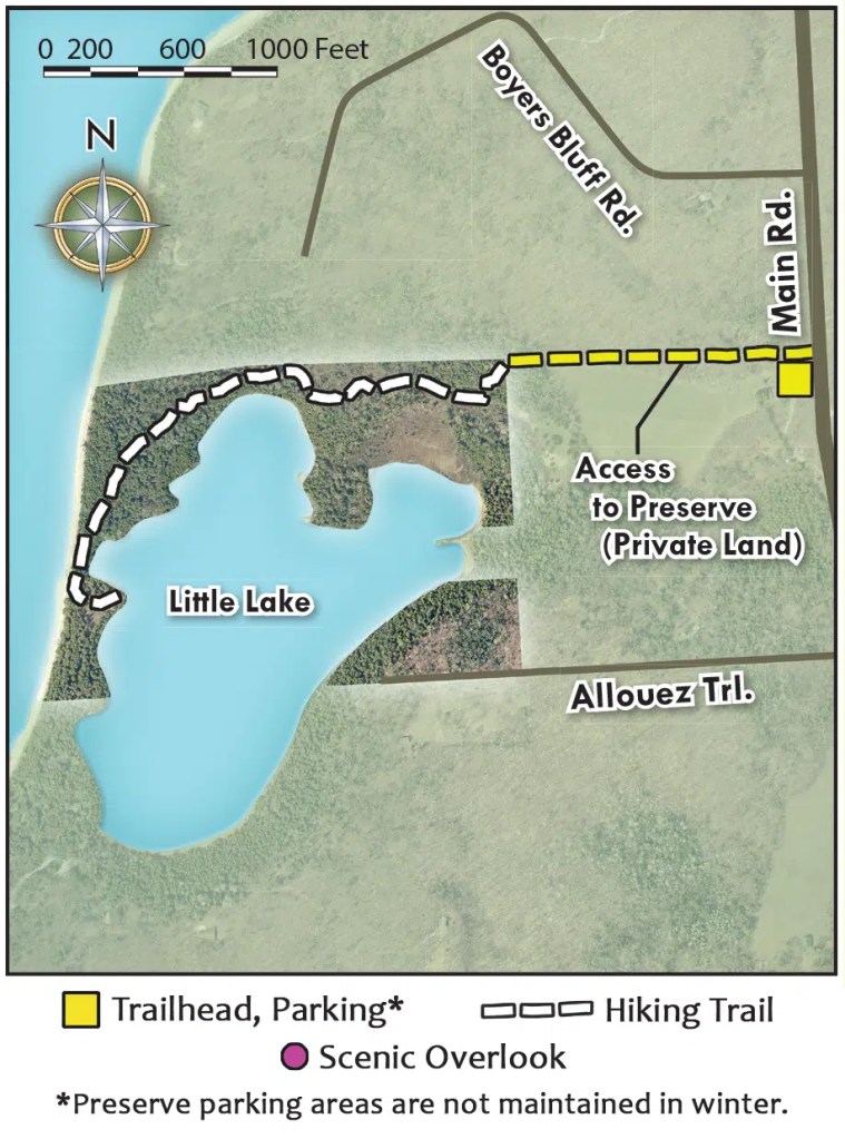 From the ferry dock, take Lobdell Point Road to Main Road. Turn left and continue on Main Road. Trailhead to the 0.8 mile out-and-back trail is located at 2285 Main Road 1.2 miles past the intersection of Main and Jackson Harbor Roads. Park along the side of the road.